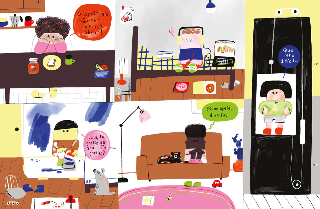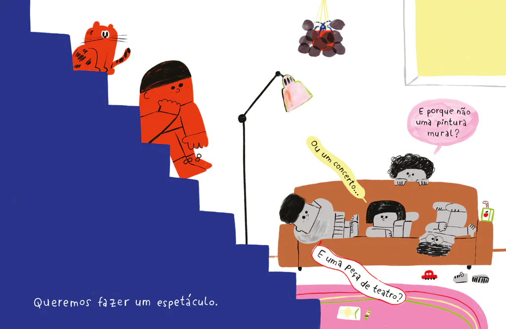 A Noa, o Óscar, a Khadija, a Sara e o Cheng são amigos e querem fazer um espectáculo. Cada um tem a sua ideia. Escrevem, ensaiam e nem sempre se entendem. Mas, diferenças artísticas à parte, tudo é possível! O novo álbum da premiada ilustradora Catarina Sobral convida-nos a entrar em cena com uma história inclusiva e divertida sobre o universo do teatro, a importância do trabalho de equipa e, também, da amizade.