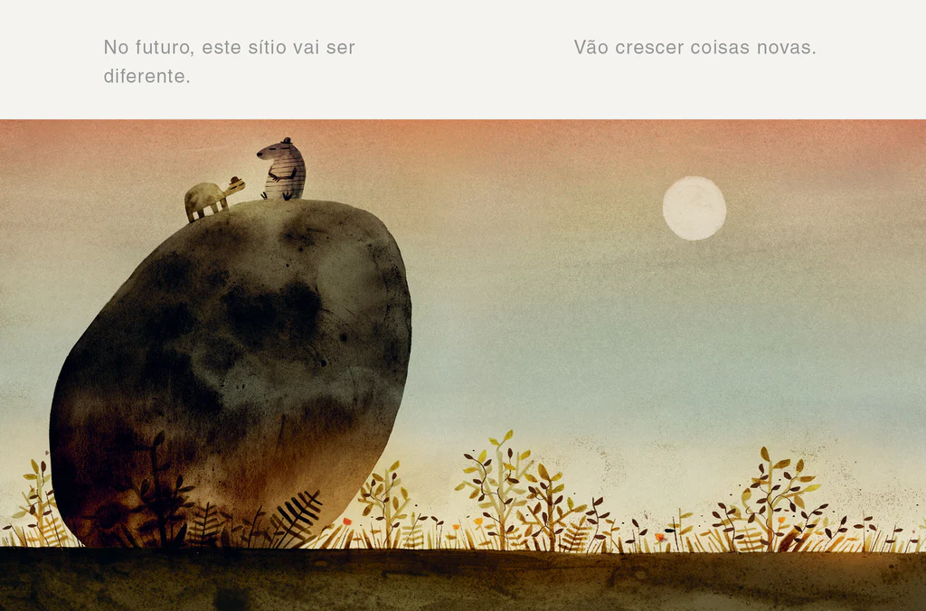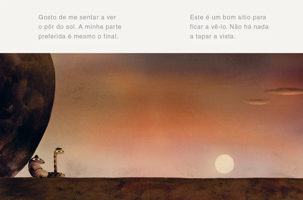Três personagens conhecem-se, sentem amizade, inveja, medo, imaginam o futuro e vêem o pôr-do-sol. O enredo adensa-se com o alienígena, a intensa troca de olhares, os silêncios cúmplices, numa vertigem de ascensão e queda hilariante, que só Jon Klassen sabe encenar.